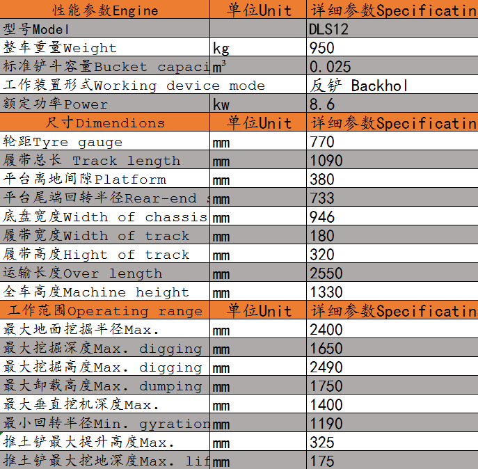 DLS12微型履帶挖掘機參數