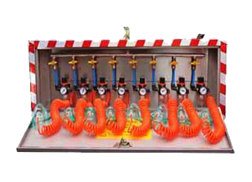 壓風自救器一般形成系統后使用,即由若干組壓風自救裝置安裝在同一個地點形成壓風自救站,每組一般由3~5個頭組成,每個地點裝多少個頭,應視該工作場所的工作人數而定,其安裝頭數應大于在該場所工作的人數。該裝置系統結構簡單,價格便宜,是一種經濟型永久性自救裝置系統。