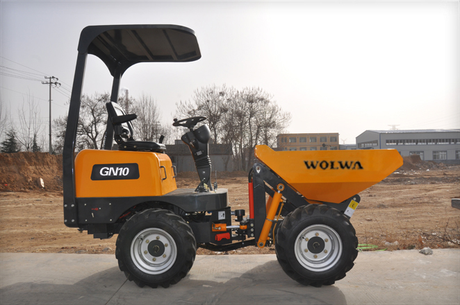 微型翻斗車主要由料斗和行走底架組成,借助斗內(nèi)物料的重力或液壓缸推力傾翻卸料。卸料按方位不同,分前翻卸料、回轉(zhuǎn)卸料、側(cè)翻卸料、高支點卸料(卸料高度一定)和舉升傾翻卸料(卸料高度可任意改變)等方式。