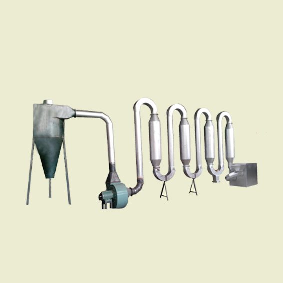 該機主要由熱風(fēng)爐、U型脈沖管、風(fēng)機、剎克隆等部分組成,在引風(fēng)機作用下熱風(fēng)和物料同時被吸入管道中。含水物料懸浮于高速熱氣流中,通過干燥管道。由于脈沖管作用,氣流發(fā)生旋轉(zhuǎn),使物料不斷翻滾,增大了與熱氣流的傳熱交換,提高了熱效率。物料在3-5秒時間內(nèi)即完成干燥,被旋風(fēng)分離器及袋式收集器收集。回收效率高達(dá)98%,可連續(xù)干燥大量物料。