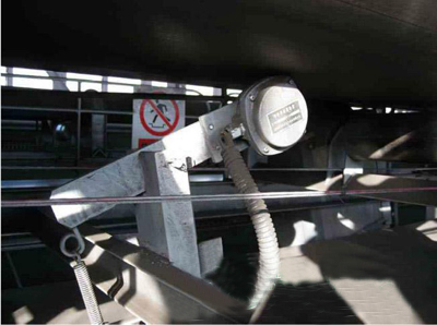 倒帶斷帶檢測(cè)裝置由頭部、中部、尾部三個(gè)倒帶檢測(cè)裝置、拉緊裝置限位 檢測(cè)組成。倒帶檢測(cè)安裝于帶式輸送機(jī)頭、中、尾部用于檢測(cè)膠帶倒轉(zhuǎn), 當(dāng)帶式輸送機(jī)正常運(yùn)行或停止時(shí),倒帶檢測(cè)不發(fā)出報(bào)警信號(hào),當(dāng)膠帶斷裂 后,膠帶下滑帶動(dòng)檢測(cè)裝置觸輪倒轉(zhuǎn),發(fā)出報(bào)警信號(hào)。斷帶檢測(cè)裝置原理 是拉緊裝置上的限位開(kāi)關(guān)、接近開(kāi)關(guān)動(dòng)作后,發(fā)出報(bào)警信號(hào)用于檢測(cè)斷帶 事故。自鎖裝置上的接近開(kāi)關(guān),用于檢測(cè)倒帶斷帶自鎖裝置是否動(dòng)作。在 電控箱上顯示倒帶斷帶裝置工作狀態(tài)并輸出報(bào)警信號(hào)。