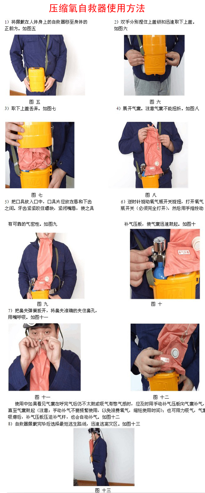 1、本產品是一種隔絕閉路循環式呼吸器,佩戴后人體呼吸系統與外界隔絕,可以防止各種有毒有害氣體進去人體。